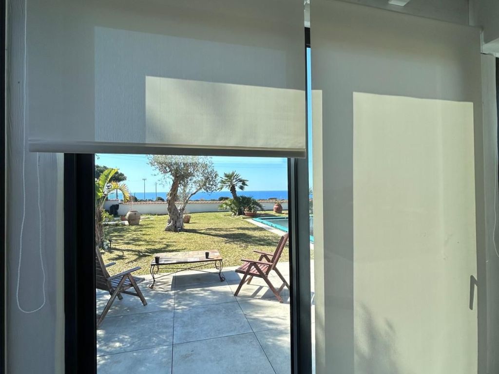 In questo ambiente abbiamo installato tende a rullo con tessuto screen, una soluzione tecnica capace di unire protezione solare e privacy senza rinunciare alla luminosità naturale.