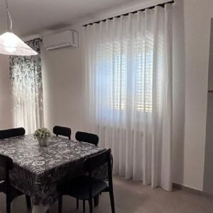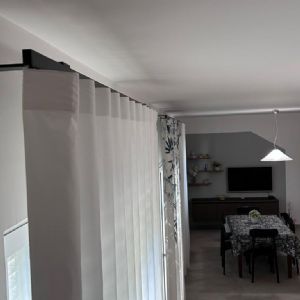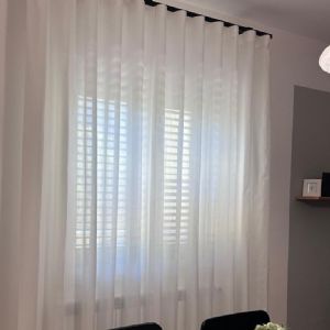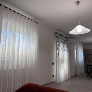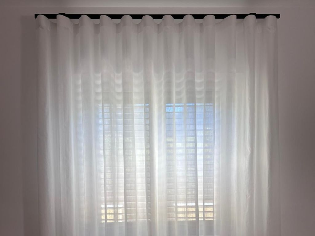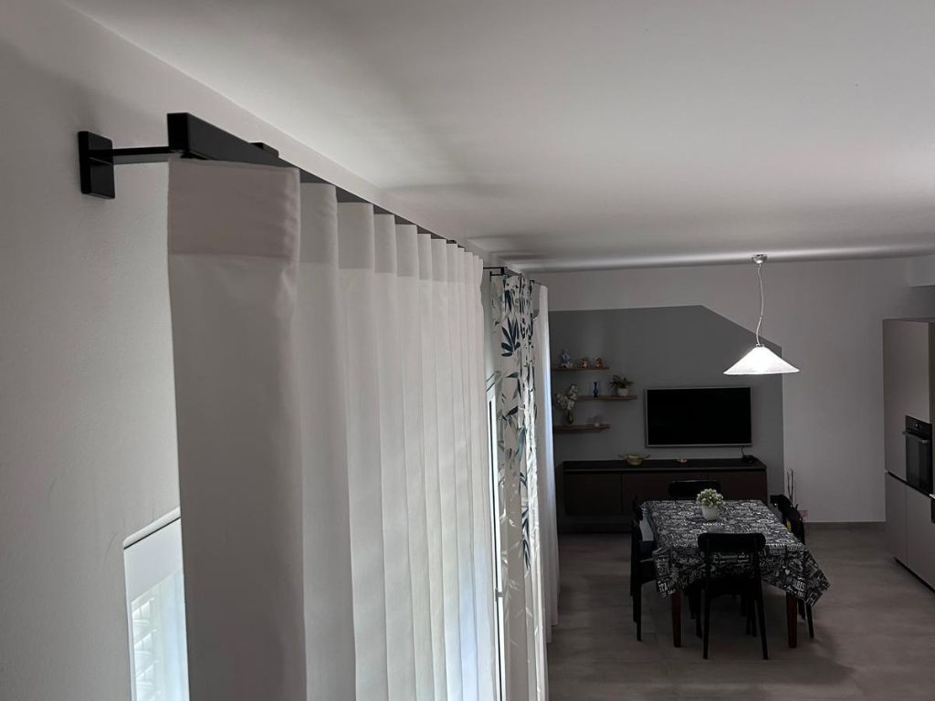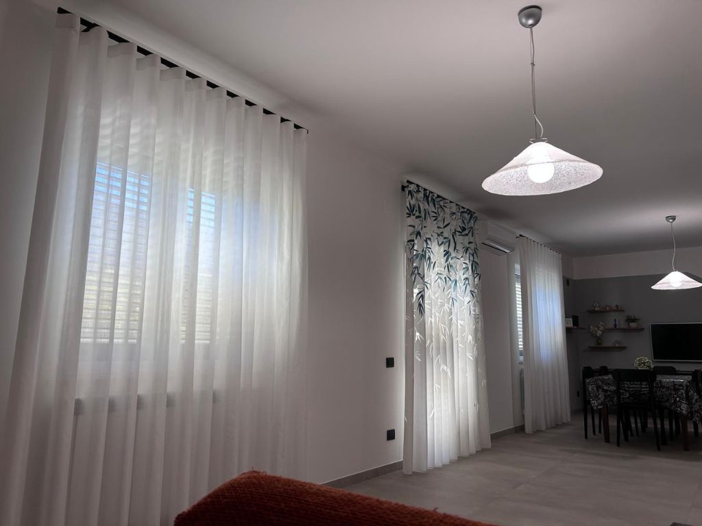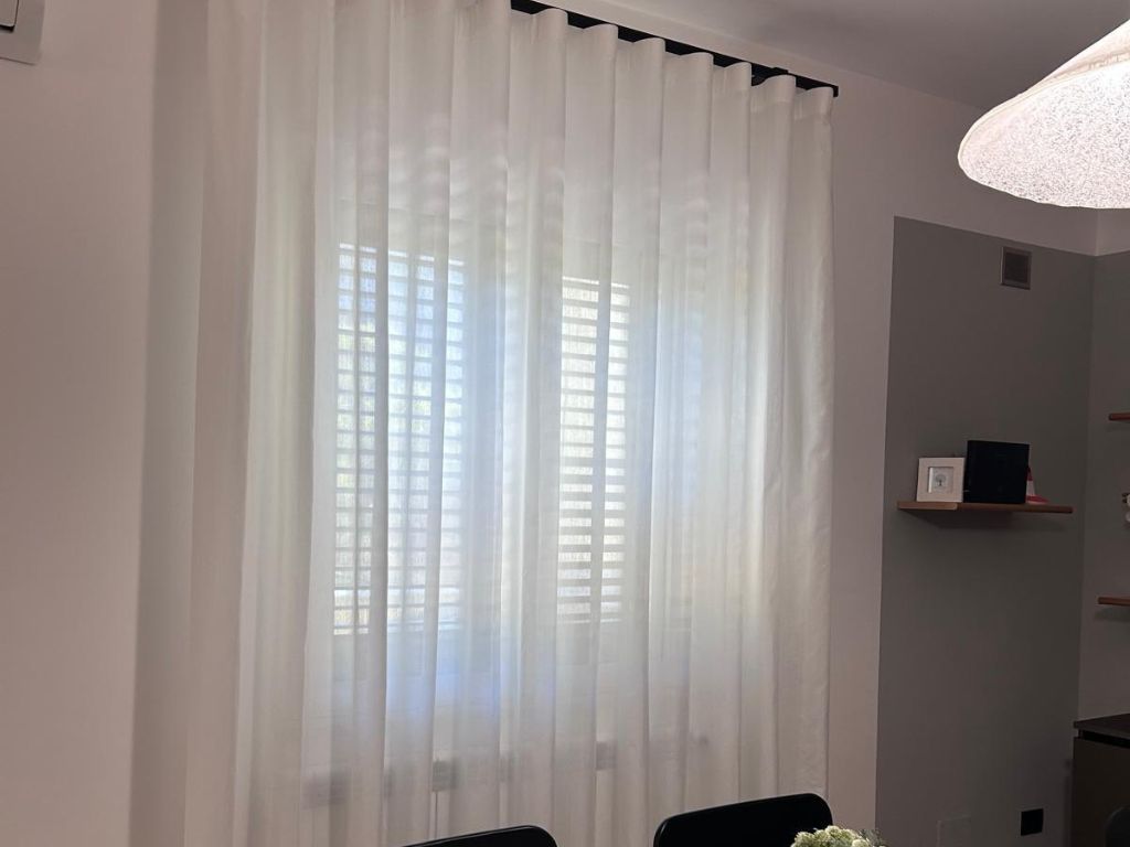 🤍 Tende laterali in tinta unita bianco misto seta, morbide e luminose, per dare equilibrio e continuità allo spazio.