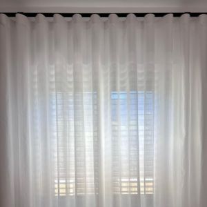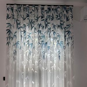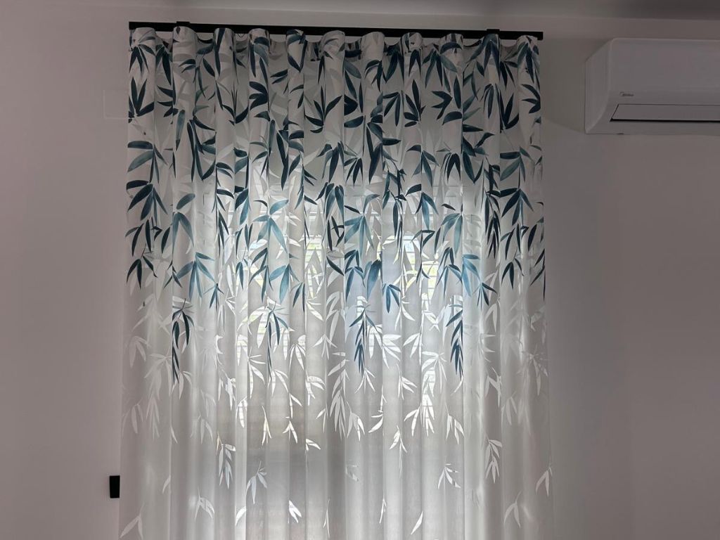 🌿 Tenda centrale devorè, con motivo naturale, che crea giochi delicati di trasparenze e profondità.