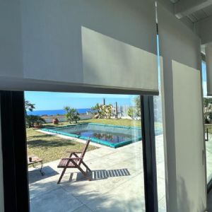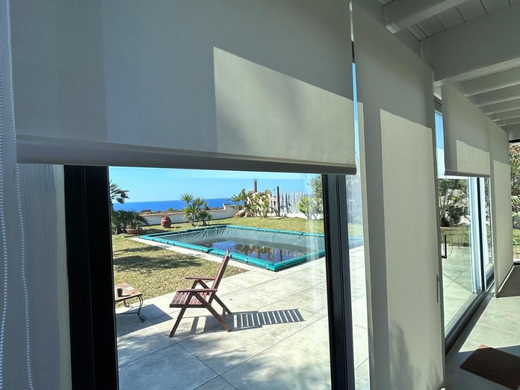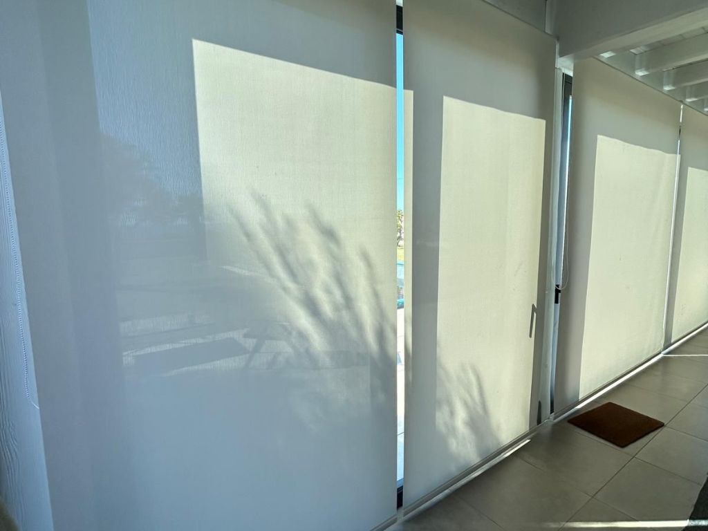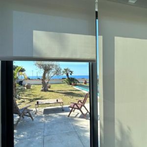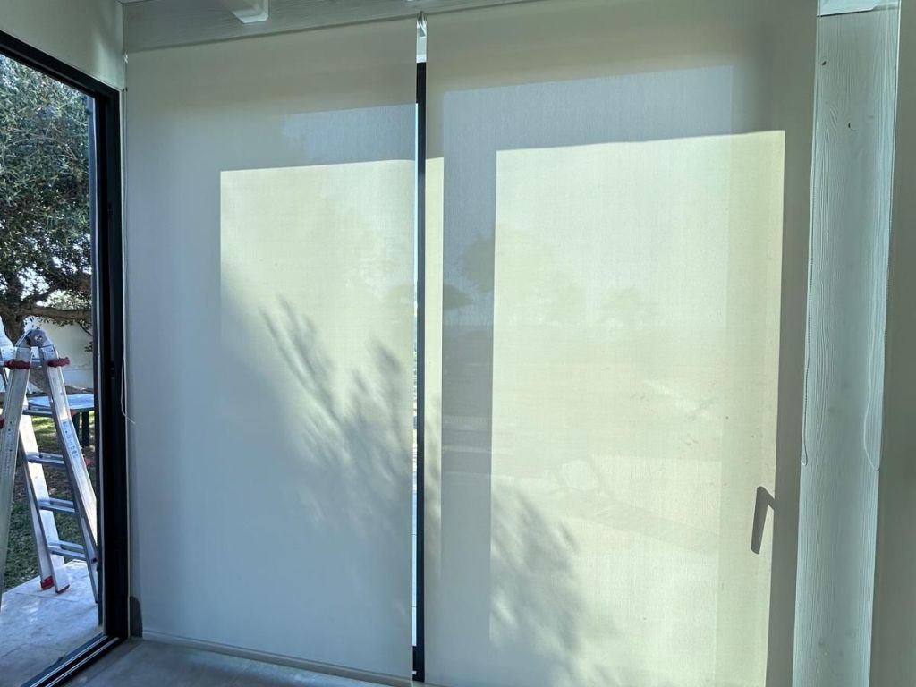 In questo ambiente abbiamo installato tende a rullo con tessuto screen, una soluzione tecnica capace di unire protezione solare e privacy senza rinunciare alla luminosità naturale.